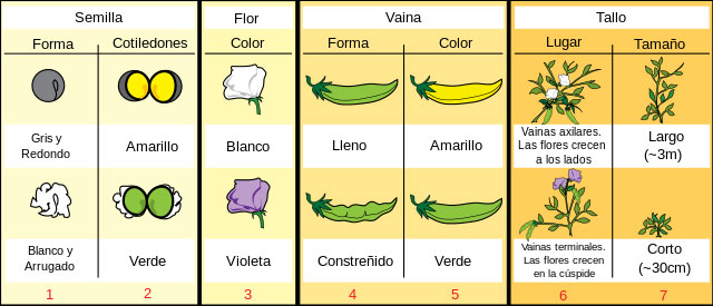 abad Gregor Mendel, que en las huertas de la abadía, sus famosos experimentos con guisantes. Fuente: Wikimedia Podemos decir por lo tanto que Mendel aceptó las ideas sobre la evolución de Darwin. Pero Mendel no aceptó sin más todas las premisas sobre la evolución del gran naturalista inglés. Concretamente, en su texto se opone varias veces a la idea de Darwin expresada en El Origen de que las condiciones de cultivo de las plantas pueden incrementar la aparición de variación heredable (sobre la que luego actúa la selección natural). Esto era algo central en la teoría de Darwin por cuanto por analogía trataba de aplicarlo también a lo que sucede en la naturaleza cuando cambian las condiciones de vida. Por su parte, Mendel, por ejemplo, al final del penúltimo capítulo de su obra contradice, acertadamente, tales aserciones, y escribe que tal variabilidad ocurre: “según una ley determinada que halla su fórmula en la combinación de varios factores independientes” refiriéndose aquí a “sus factores”, que ahora llamamos genes, que controlan la variabilidad de los organismos, y cuyo barajamiento se propicia por el cultivo y cruzamiento de distintas variedades. Darwin y la herencia Como hemos dicho antes, Darwin publicó en 1858 su teoría de que los seres vivos son el resultado de procesos selectivos que han actuado sobre las variaciones hereditarias que han ido apareciendo durante la historia de nuestro planeta. Pero Darwin en ese momento no tenía una idea clara de cómo se heredan tales variaciones y así lo confiesa en El Origen. De hecho en el primer capítulo decía: “Las leyes que rigen la herencia son, en su mayor parte, desconocidas”. Por ello siguió pensando e investigando sobre el asunto de la herencia. Así que diez años después, en el año 1868, aprovechando la publicación de otra extensa obra,” La Variación de los animales y plantas bajo domesticación”, antes de las conclusiones finales, incluyó un capítulo, el 27, que tituló “La hipótesis provisional de la Pangénesis ” que versa sobre cómo ocurre la herencia según su punto de vista. Según esta hipótesis, los distintos órganos y tejidos de los seres vivos emiten a lo largo de todas sus vidas unas especies de partículas con información de sus características, él las llamo gémulas, que viajan por el torrente circulatorio hasta los órganos y tejidos encargados de la reproducción. Y allí tras la fecundación se produciría una unión-interacción entre las gémulas de los dos progenitores, por lo que el resultado final es que los descendientes heredan una mezcla de las características de ellos en sus distintos componentes. Esta hipótesis de la herencia es muy diferente de la propuesta por Mendel dos años antes, según la cual la herencia queda determinada por la existencia de unos “factores” (genes los llamamos ahora) en las células reproductivas que se transmiten a la descendencia sin mezcla, y de forma independiente los que están detrás de una característica de los que están detrás de las otras. ![]() Los siete caracteres que observó G. Mendel en sus experiencias