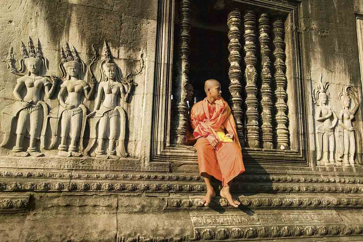 HOMENAJE A VISHNÚ Los orígenes de una civilización En el mítico combate entre dioses (deva) y demonios (asura), Vishnú, al que estaba consagrado inicialmente Angkor, facilitó la victoria de los deva al proporcionarles el néctar batido del océano de leche, elixir de inmortalidad. Los bajorrelieves de Angkor narran ese y otros episodios del Mahabharata. Destacan los cientos de apsaras, ninfas de gran belleza y elegancia que deleitaban a los deva y en cuyas gráciles posturas se basa la danza camboyana, una de las más bellas del mundo. Y abundan los elefantes, tanto por la potencia que imprimen a los ejércitos como por encarnar las nubes monzónicas preñadas de lluvia. FOTO: ALVARO LEIVA / AGE FOTOSTOCK |