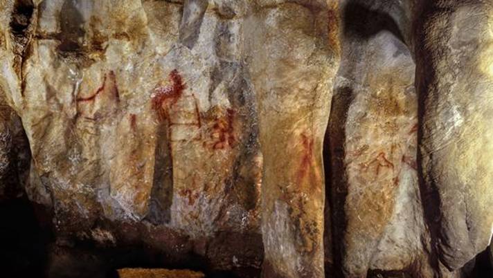 Pigmento rojo en la cueva de Ardales. Muchas áreas de esta formación de estalagmitas fueron pintadas por neandertales en al menos dos episodios, uno hace más de 65.000 años y otro hace unos 45.000 años - CD StandishIndistiguibles del hombre moderno Lo que sí está claro es que estas pinturas demuestran una vez más la capacidad cognitiva de los neandertales, de los que también se sabe que, por ejemplo, enterraban a sus muertos, cocinaban y adornaban su cuerpo. «Los neandertales y los humanos modernos compartieron el pensamiento simbólico y debían de haber sido cognitivamente indistinguibles», concluye Joao Zilhão, de ICREA, Institución Catalana de Investigación y Estudios Avanzados. Por ese motivo, «en nuestra búsqueda de los orígenes de la cognición humana avanzada, debemos mirar más atrás en el tiempo, hace más de medio millón de años, al ancestro común de los neandertales y los humanos modernos». ![]() Tres manos en la cueva de Maltravieso. La de origen neandertal, en el centro-H. Collado Reservar las capacidades simbólicas y de abstracción al Homo sapiens es, para los investigadores, un completo error. La cuestión es fundamental, ya que la capacidad de los humanos primitivos para crear arte se considera como un hito evolutivo íntimamente relacionado con el desarrollo del lenguaje y nuestra capacidad de formar y vivir en sociedades complejas. «Me gustaría ver la expresión en algunas caras mientras leen los periódicos», confiesa Zilhão, quien lleva años reivindicando la capacidad mental de los neandertales, en un artículo que se publica junto al estudio en «Science».