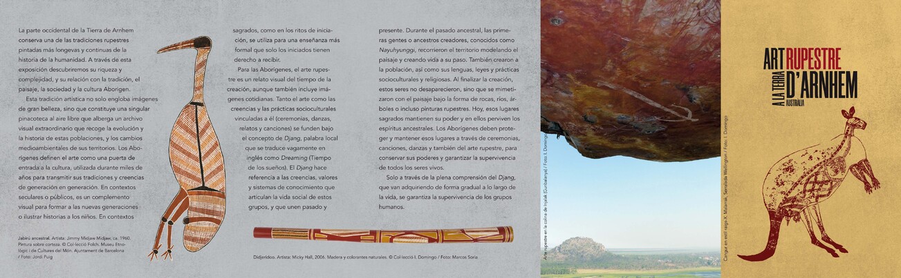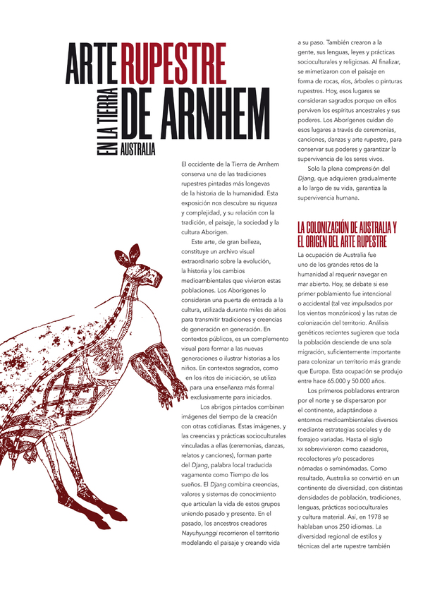 ![]() recorrido por una de las tradiciones artísticas más longevas y continuas de la historia de la humanidad: el arte rupestre de la parte occidental de la Tierra de Arnhem. Con esta muestra se dará a conocer la riqueza y los múltiples niveles de interpretación del arte rupestre de los Aborígenes australianos, así como su relación con la sociedad y con la cultura Aborigen. La parte occidental de la Tierra de Arnhem conserva una de las tradiciones rupestres pintadas más longevas y continuas de la historia de la humanidad. A través de esta exposición descubriremos su riqueza y complejidad, y su relación con la tradición, el paisaje, la sociedad y la cultura Aborigen.Esta tradición artística no solo engloba imágenes de gran belleza, sino que constituye una singular pinacoteca al aire libre que alberga un archivo visual extraordinario que recoge la evolución y la historia de estas poblaciones, y los cambios medioambientales de sus territorios. Los Aborígenes definen el arte como una puerta de entrada a la cultura, utilizada durante miles de años para transmitir sus tradiciones y creencias de generación en generación. En contextos seculares o públicos, es un complemento visual para formar a las nuevas generaciones o ilustrar historias a los niños. En contextos sagrados, como en los ritos de iniciación, se utiliza para una enseñanza más formal que solo los iniciados tienen derecho a recibir. Para las Aborígenes, el arte rupestre es un relato visual del tiempo de la creación, aunque también incluye imágenes