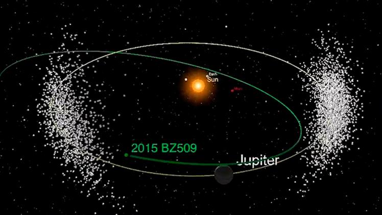 Las estrellas se forman en cúmulos con varios astros nacientes, cada uno con sus propios planetas y asteroides. Los dos astrónomos argumentan que fue entonces cuando el asteroide fue arrastrado al Sistema Solar atraído por la gravedad de Júpiter y quedó anclado en su órbita, donde ha sobrevivido hasta ahora. “La probabilidad de una colisión entre asteroides es muy baja, lo más peligroso en este caso son las perturbaciones que suceden al cruzarse con los planetas gigantes”, señala Morais. El 2015 BZ509 se cruza con Júpiter dos veces cada 11 años y medio, el tiempo que este gigante gaseoso tarda en completar una órbita en torno al Sol. En este caso, la distancia más corta entre ambos es de 176 millones de kilómetros, pero estos encuentros son esenciales, pues Júpiter le pega un pequeño tirón gravitatorio al asteroide que le permite seguir en esta órbita sin desviarse.
