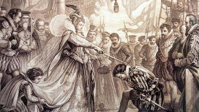 ![]() Grabado de la época donde la Reina Isabel I nombra caballero