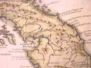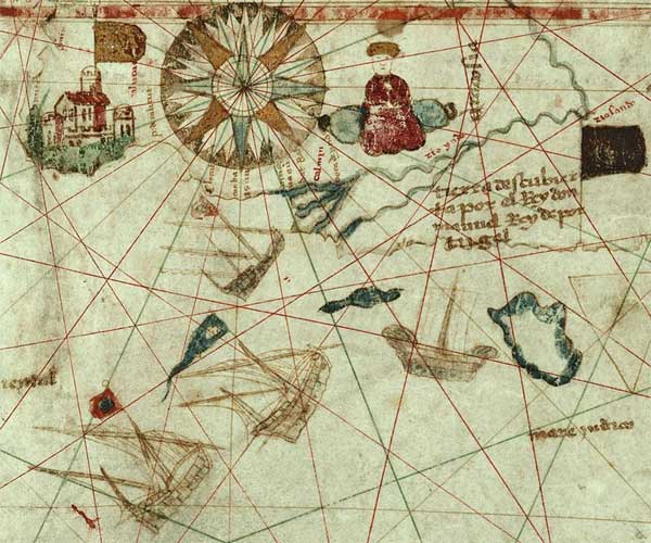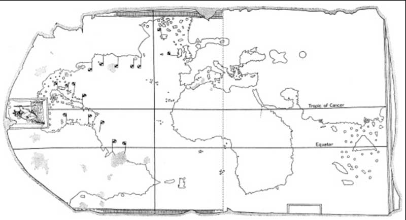 Mapa de Juan de la Cosa ![]() El Nuevo Mundo aparece en la parte superior (en verde) y el Viejo Mundo en la parte central e inferior (en blanco). El mapa o carta de Juan de la Cosa es un mapamundi pintado sobre pergamino, de 93 cm de alto por 183 de ancho, que se conserva en el Museo Naval de Madrid. Una inscripción dice que fue realizado por el marino cántabro Juan de la Cosa en 1500 en El Puerto de Santa María (Cádiz). Su rica decoración indica que probablemente fue hecho por encargo de algún miembro poderoso de la corte de los Reyes Católicos. El mapa es la representación inequívoca del continente americano más antigua conservada; en él aparecen las tierras descubiertas hasta finales del siglo XV por las expediciones castellanas, portuguesas e inglesas a América. También muestra una gran parte del Viejo Mundo, según el estilo típico de los portulanos medievales, incluyendo noticias de la reciente llegada de Vasco de Gama a la India en 1498. La carta de Juan de la Cosa es la única obra cartográfica conservada de las realizadas por los testigos presenciales de los primeros viajes de Cristóbal Colón a las Indias. El mapa hace alusión al descubridor mediante una gran imagen de San Cristóbal que cubre la zona donde debería estar Centroamérica. Sin embargo, Cuba se representa como una isla, en contra de la opinión de Colón, que la consideraba una península de Asia. Descripción física La carta de Juan de la Cosa es una obra manuscrita, de 93 cm de alto (norte-sur) por 183 de ancho (este-oeste), dibujada sobre dos hojas enlazadas de pergamino de piel de ternera cosidos a un lienzo resistente. Los dos trozos están pegados por el centro, a la altura de Italia y África, y su forma no es simétrica ya que la parte occidental corresponde al cuello del animal. Está ilustrada con tinta y acuarelas. El Nuevo Mundo aparece representado en verde mientras que el Viejo Mundo no está coloreado. En el mapa se señalan los ríos, puertos y núcleos de población mediante símbolos convencionales. Además está profusamente decorado a la manera de los portulanos de la escuela mallorquina con rosas de los vientos, banderas, embarcaciones, reyes africanos y personajes legendarios, por ejemplo el preste Juan de las Indias en África y los Reyes Magos en Asia. La rosa de los vientos situada en el Atlántico contiene una representación de la Virgen y el Niño. En el extremo superior del mapa, cubriendo la región centroamericana, existe un recuadro con una imagen de San Cristóbal, probable alusión a Cristóbal Colón.3 Bajo el santo aparece la referencia al autor y fecha del mapa: Juan de la cosa la fizo en el puerto de S: mã en año de 1500. En el margen inferior, a la derecha, aparece otra cartela pero en blanco, aparentemente reservada para algún texto que al final no se incluyó. Su estado de conservación es en general bueno pero con algunos desperfectos: desconchados en la parte superior así como diversos deterioros debidos a un incendio. Contiene numerosos topónimos, escritos en castellano, pero algunos de ellos son ilegibles, sobre todo en el Nuevo Mundo. Historia Autor y fecha ![]() Texto del mapa que indica el autor, lugar y fecha de realización. Una cartela del mapa afirma que «Juan de la cosa la fizo en el puerto de S: mã en año de 1500»; es decir, que "Juan de la Cosa la hizo en El Puerto de Santa María en el año 1500". Juan de la Cosa fue un marino nacido en Cantabria a mediados del siglo XV y muerto en la costa de la actual Colombia en 1509. Tuvo un papel destacado en el primer viaje de Colón a las Indias (1492-93) ya que fue como maestre de la nao capitana, la Santa María. También tomó parte en el segundo viaje del Almirante (1493-96). En 1499 se asoció con Alonso de Ojeda para realizar una expedición propia a América, en la que participó también Américo Vespucio. Partieron en mayo de 1499, recorrieron una parte sustancial de la costa atlántica de Sudamérica y regresaron o bien en noviembre de 1499 o bien en junio de 1500. Se sabe que de la Cosa traía ya un boceto de mapa consigo en el regreso de este viaje. De la Cosa volvió a hacerse a la mar en la expedición de Rodrigo de Bastidas (finales de 15007 o mediados de 1501 según diferentes autores) y debió realizar su carta durante el verano u otoño de 1500. La rica ornamentación indica que probablemente fue realizada por encargo de algún personaje poderoso, quizás el obispo Fonseca. Controversias y analíticas Algunos historiadores han puesto en duda que la carta date de 1500 porque estiman que parte de la información cartográfica contenida en ella no había sido descubierta aún en aquel año. El primero en formular esta teoría fue George E. Nunn en 1934, que afirmaba que Cuba no fue circunnavegada hasta 1509 y que por ello de la Cosa no podía saber que era una isla, que es como correctamente la muestra el mapa. Sus argumentos han sido rebatidos desde entonces, mostrándose por ejemplo que Pietro Mártir ya escribió en 1501 que "muchos afirman haber navegado alrededor de Cuba". Otros autores han apuntado que en la carta no figuran muchos de los acontecimientos posteriores a 1500, como por ejemplo el tercer viaje del propio de la Cosa al Nuevo Mundo (1501-1502), que descubrió el golfo de Urabá y la costa del Darién. ![]() Mapa del Darién de 1698. Otra teoría, más ampliamente aceptada, afirma que el mapa que se conserva es una copia del original preparado por de la Cosa. Un indicio a favor de esta teoría es el hecho de que muchos topónimos son ilegibles, como si el copista no hubiese sido capaz de descifrar la letra del autor original. El historiador Hugo O'Donnell ha ido más lejos, opinando que el trabajo de Juan de la Cosa se limitó a un bosquejo que luego fue completado y enriquecido por algún otro cartógrafo. Por otro lado, en 1987 el Gabinete de Documentación Técnica del Museo del Prado mostró mediante diversos análisis que los pigmentos de la carta eran comp