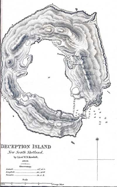 En 1829 el capitán británico Henry Foster con el barco Chanticleer visitó la isla, realizando mediciones topográficas, pendulares y magnéticas en la caleta Péndulo. Fue la primera expedición con fines científicos que visitó la isla, y luego de dos meses de trabajo el teniente Kendall realizó el primer mapa topográfico de la isla Decepción.
