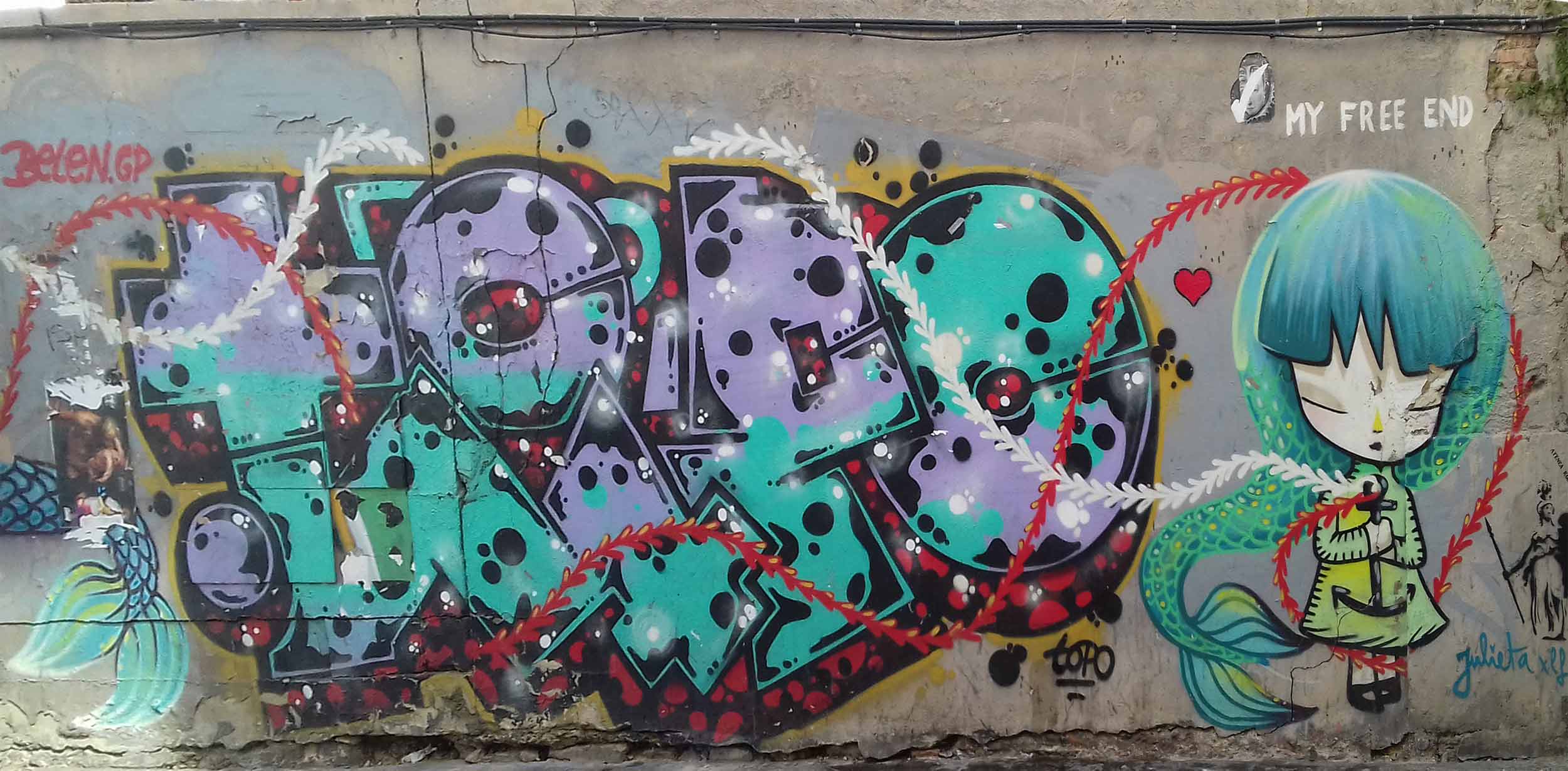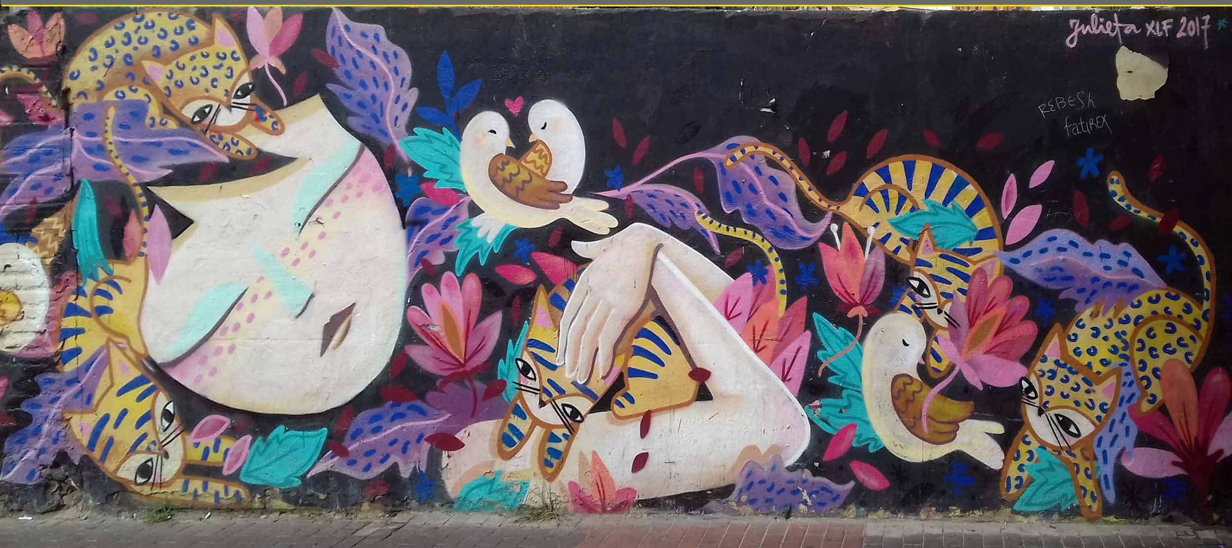 Julieta XLF - carrer Pintor fillolJulia Silla, más conocida como Julieta.xlf (Valencia, 1982) es una artista urbana española, especializada en postgrafiti. Es miembro del grupo XLF (Por la Face). Julieta.xlf, licenciada en Bellas Artes por la Universidad de Valencia, es especialista en ilustración por la Academia de San Carlos. Empieza en el mundo del grafiti con dieciséis años, haciendo dibujos infuenciados por Escif. Más tarde, se acerca al postgraffiti, a principios de la década del 2000. Es miembro de XLF desde 2003, momento en el que el grupo empieza a tener actividad. Muy activa en la ciudad de Valencia, tiene una iconografía de marcado carácter infantil, cercana al arte oriental, con influencias del kawaii japonés y el pop psicodélico. Sus murales suelen estar protagonizados por muñecas, de la que se han destacado que esconden perplejidad y sensibilidad. A pesar de no tener un mensaje directo, las obras de Julieta intentan transmitir esperanza y conceptos como crecer o el equilibrio vital, además de reivindicar aspectos esenciales como el color, la naturaleza o la alegría de las personas, utilizando formas orgánicas y color. Entre las influencias o artistas con estilo parecido encontramos a Muñeca, de Brasil, Hueso Gemeos y los catalanes Freaklub. En 2011 colaboró con Miguel Hache en la realización de varias fallas. |