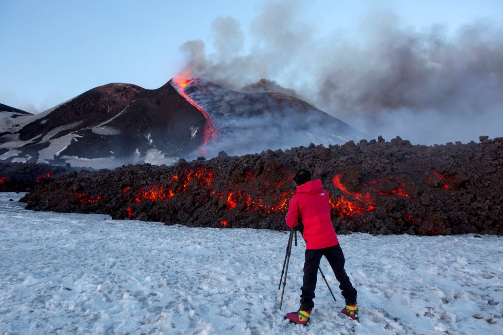 5.- En la imagen, un fotógrafo capta con su cámara una imagen del volcán siciliano Etna, que ha entrado en erupción, cerca de la ciudad de Catania (Italia). ![]()