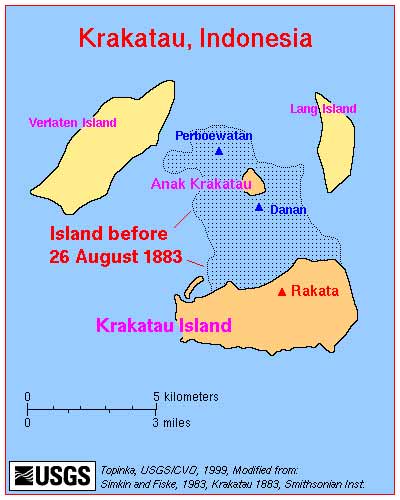 Había tres conos volcánicos en Krakatoa. De sur a norte: Rakata (823 m), Danan (445 m), y Perboewatan (también llamado Perbuatan, 122 m). Danan pudo haber sido, por sus características, un volcán gemelo. Krakatoa estaba sobre la zona de subducción eurasiática y la placa Indoaustraliana, donde los límites de esta emprenden un cambio agudo de dirección. Como resultado, es probable que la corteza sea excepcionalmente débil en la región. El estrecho de la Sonda.La erupción de 1883 Antecedentes