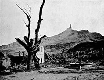 La destrucción del barrio sur de St. Pierre mirando hacia el volcán. Obsérvese la espina volcánica creciendo en la cumbre.